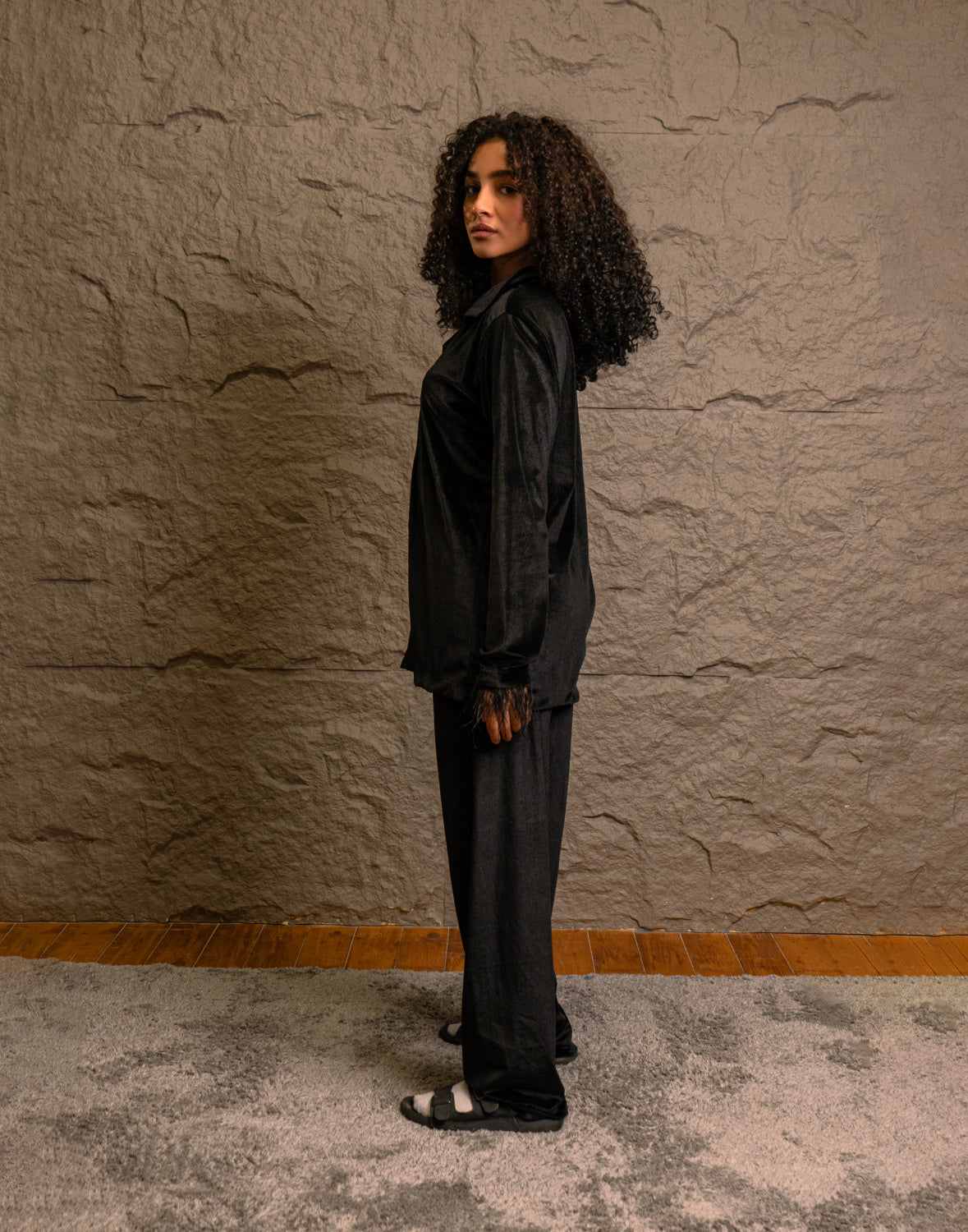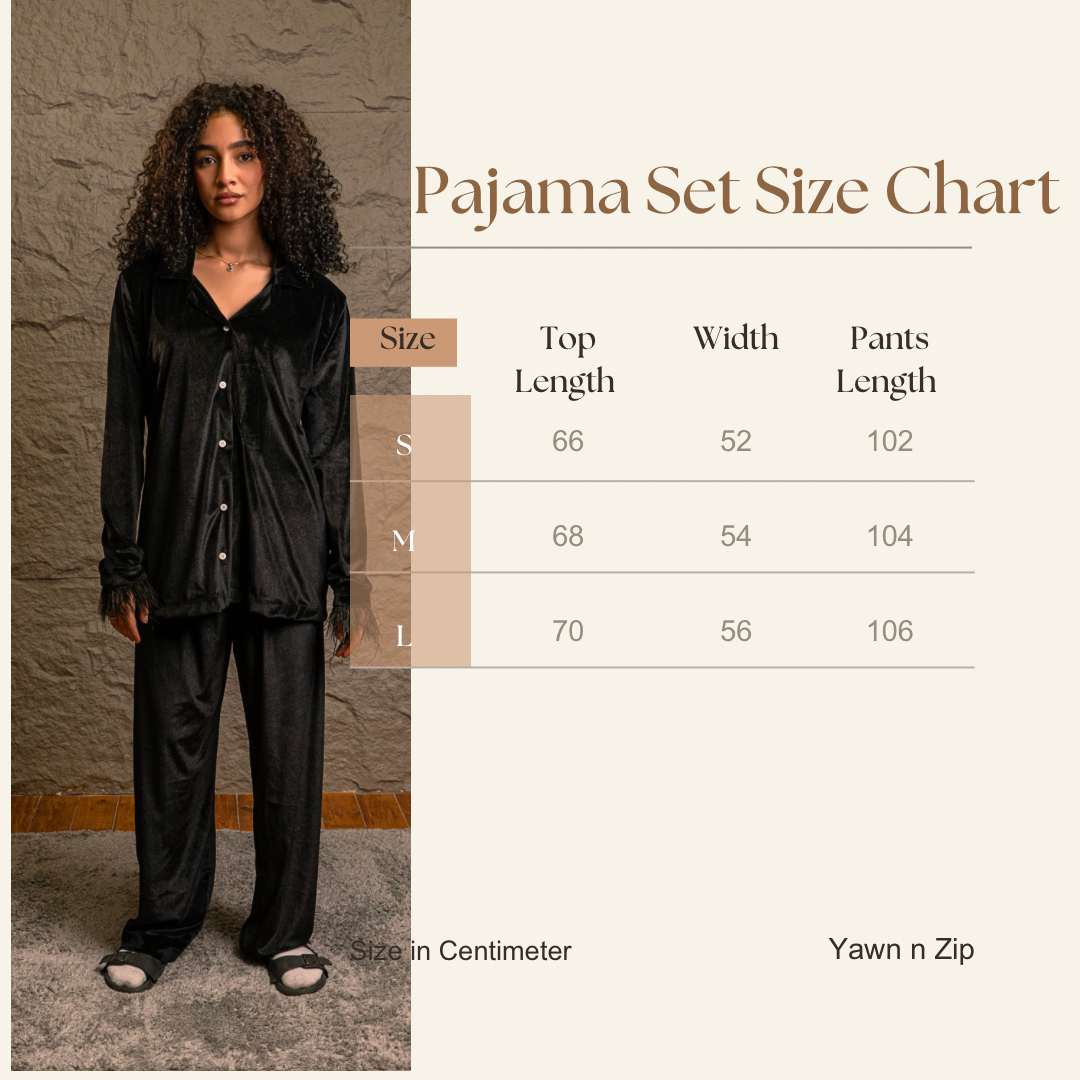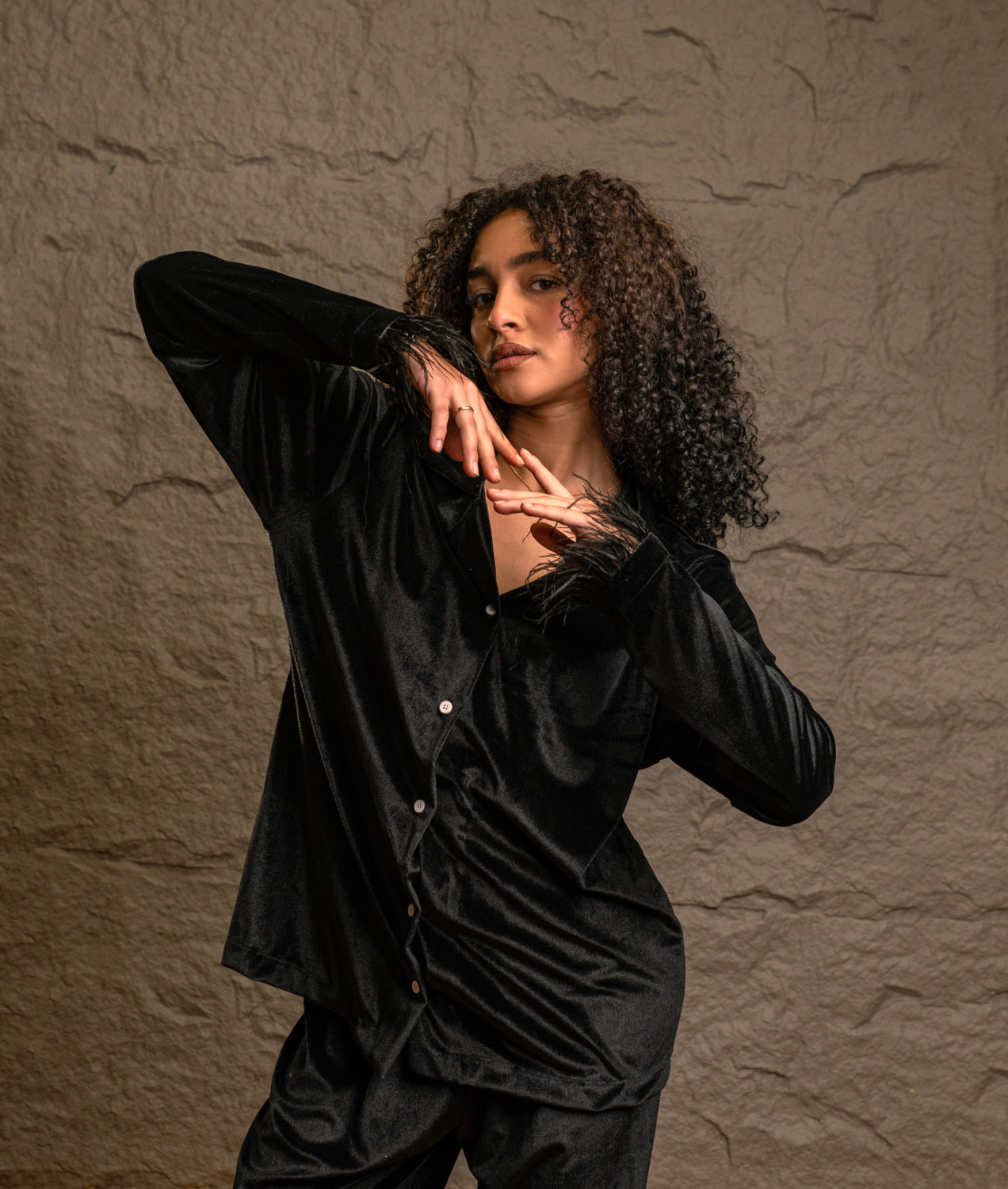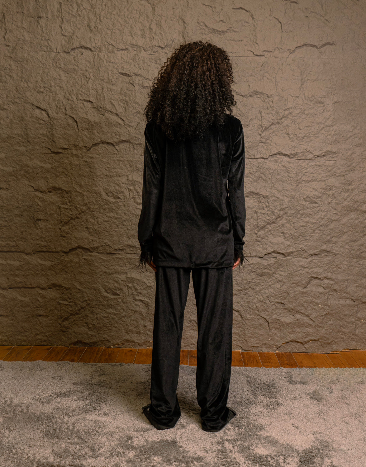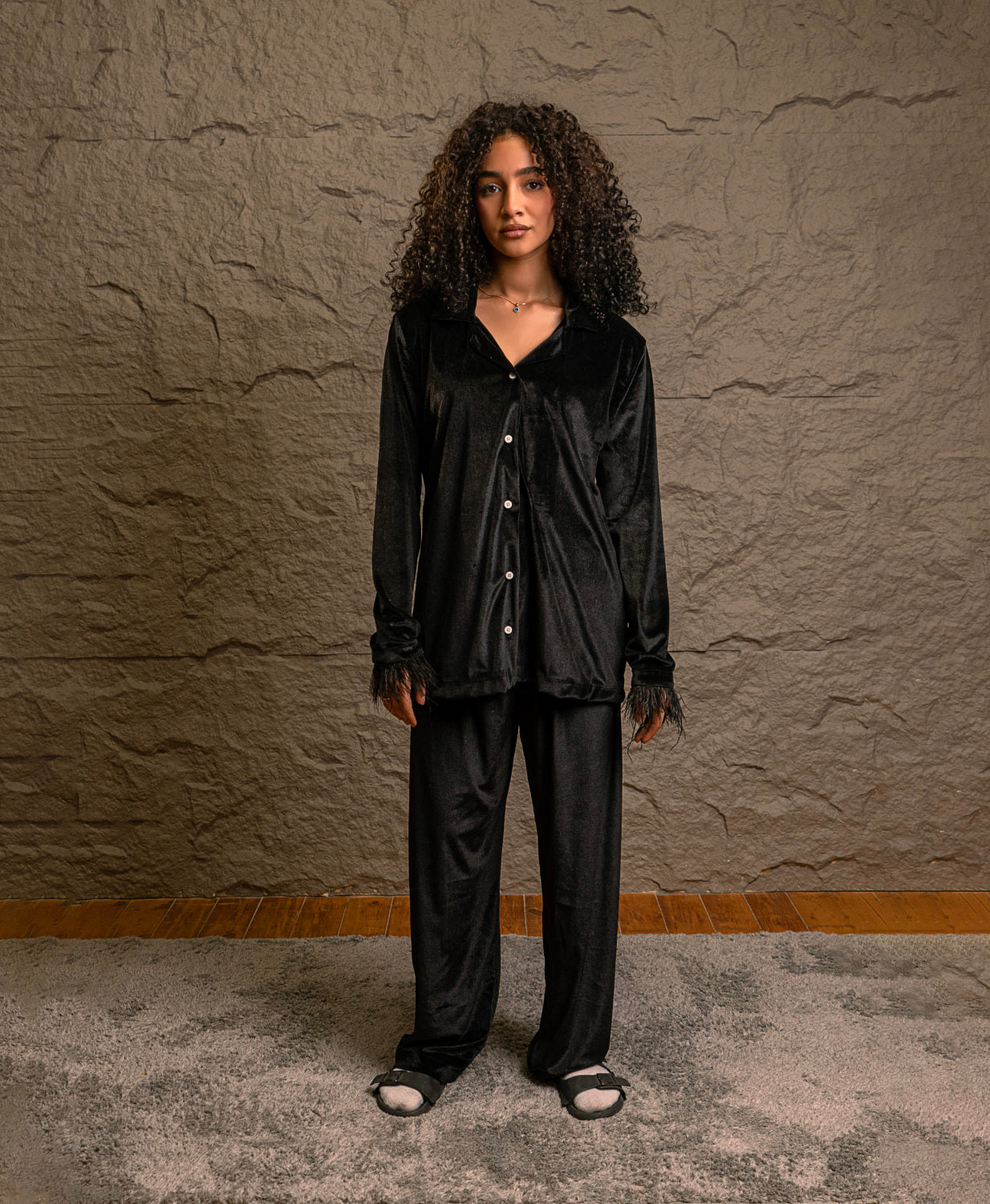 Elevate your loungewear with our black luxury pajama set, crafted from sumptuous velvet fabric for a soft, indulgent feel. Featuring elegant feather trim on the sleeves, this pajama combines sophistication with comfort, making it perfect for relaxing in style. Designed to offer a flattering fit, it’s the ultimate choice for those who appreciate both luxury and coziness at home.