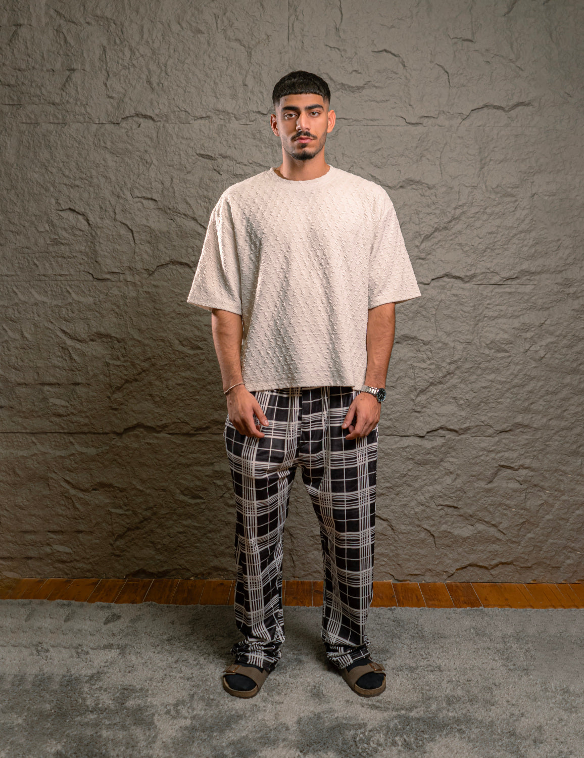 These pajama pants feature a classic black and white plaid pattern, made from soft, breathable fabric for ultimate comfort. With a relaxed fit and elastic waistband, they offer easy movement and a cozy feel—perfect for lounging around or casual homewear. Their versatile style pairs effortlessly with a variety of tops for a sleek, laid-back look.